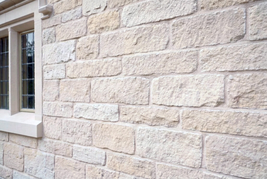 Our Park Lane sawn, split and tumbled Bath stone is guillotine-cut on state-of-the-art piano key guillotines, typically 100–125 mm on bed, with the option of standard course heights (65, 90, 115 and 140 mm) or random coursing in 3–6 inch lifts to suit regional detailing and conservation requirements.