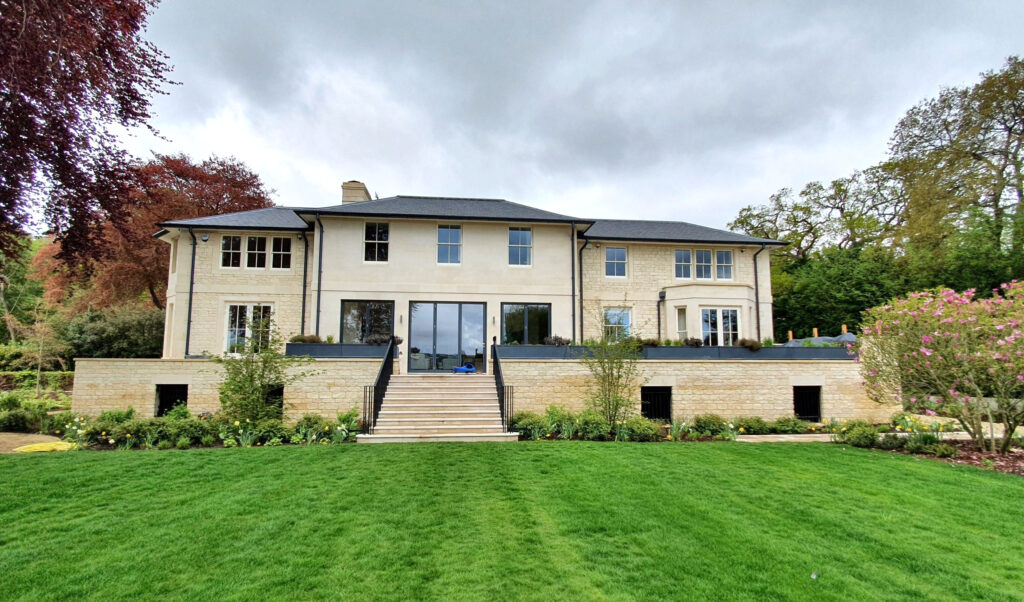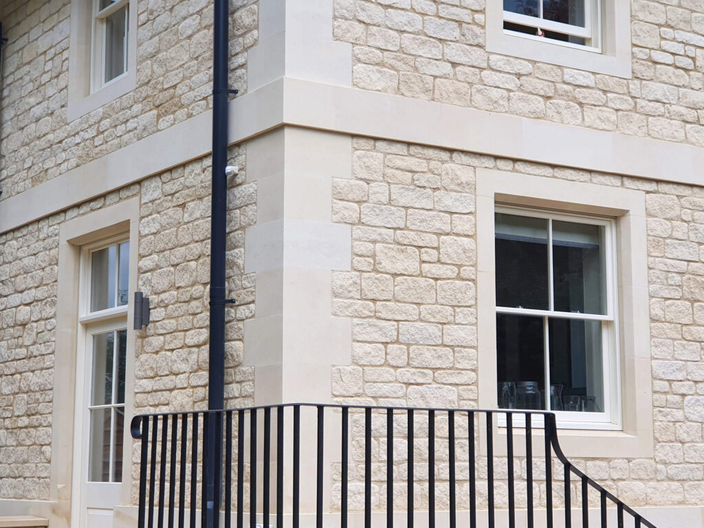 An expansive but subtle design by JCA Architects on a new build in the Southeast of England. The mix of Park Lane Bath stone ashlar and dressings as well as tumbled walling along with a very understated front and stylish rear-view make this a house of dreams. This is a residence of stature and style. Manufactured by Traditional Stone & Restoration mainly in their masonry yard in West Sussex the installation of the Bath stone is stunning and a credit to all involved.